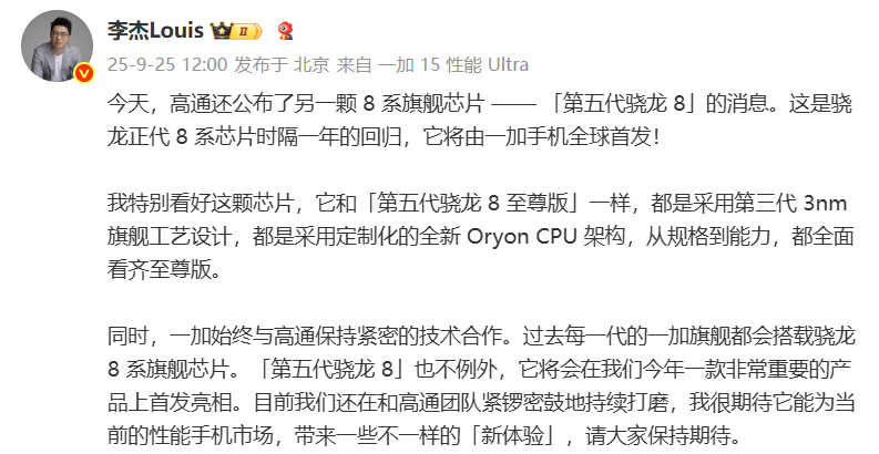9月25日,2025骁龙峰会圆满落幕,骁龙双8系双旗舰矩阵正式启用。作为旗舰双子星之一的第五代骁龙8移动平台(下称“骁龙8 Gen5”)首次亮相,一加手机官宣全球首发,性能新旗舰将于年内登场。